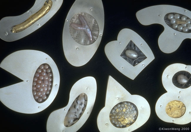 Furniture for pearls. s. silver, pearls, newspaper, 23K gold leef, 14K gold, plastic, rice paper